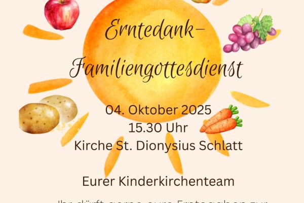 Dazu treffen wir uns am 4.10. um 14 Uhr in der Kirche und bitten um Spenden um den Altar schön gestalten zu können. Die Erntegaben können auch schon vorher in die Kirche gebracht werden.