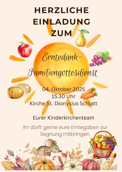 Das Kinderkirchenteam Schlatt lädt zum Familiengottesdienst zum Thema Erntedank ein. Dieser findet am Samstag, 04.10.2025 um 15.30 Uhr in der Pfarrkirche in Schlatt statt.